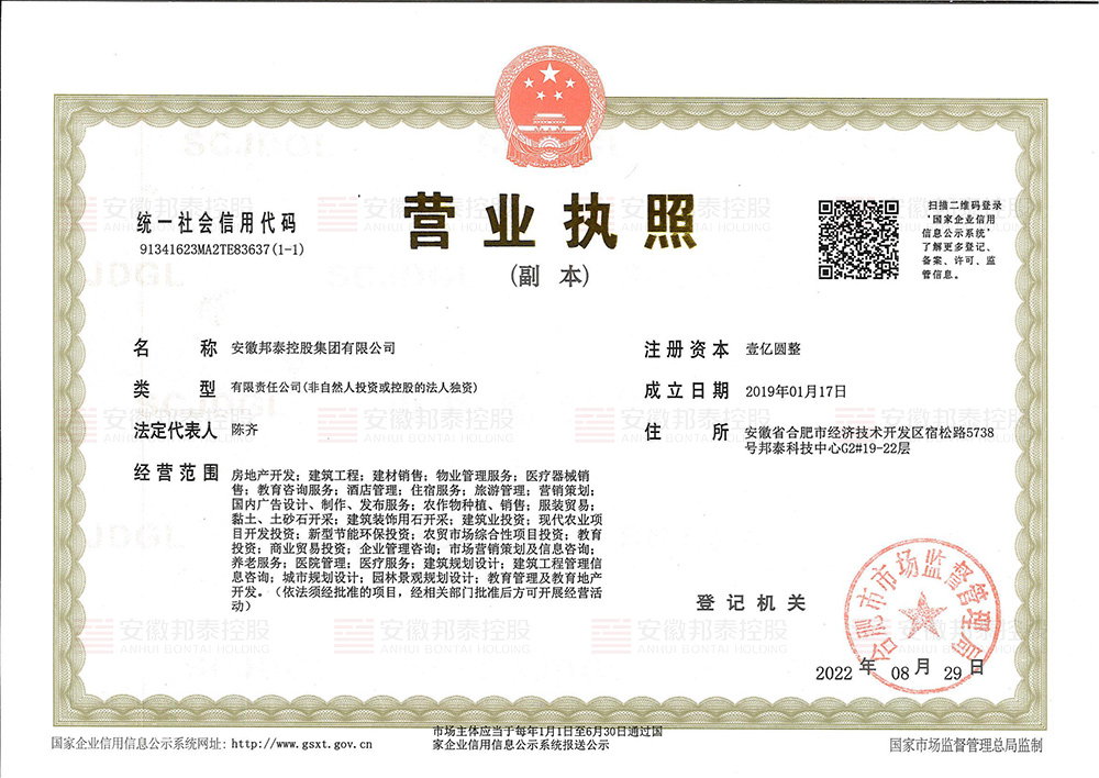 安徽邦泰控股集團(tuán)總部位于合肥,是一家以醫(yī)療大健康和房地產(chǎn)開(kāi)發(fā)為主業(yè),覆蓋醫(yī)療產(chǎn)業(yè)園區(qū)建設(shè)與運(yùn)營(yíng)、生物科技與健康管理、醫(yī)療產(chǎn)業(yè)投資、房地產(chǎn)開(kāi)發(fā)與項(xiàng)目代建、酒店管理、物業(yè)服務(wù)等產(chǎn)業(yè)的綜合型企業(yè)集團(tuán)。集團(tuán)始終秉承“成為品質(zhì)領(lǐng)先的城市服務(wù)商”的企業(yè)愿景,立足安徽、輻射全國(guó),致力于深耕所在領(lǐng)域、追求卓越品質(zhì),通過(guò)整合優(yōu)質(zhì)資源、創(chuàng)新發(fā)展模式和強(qiáng)化品牌建設(shè),為中國(guó)式現(xiàn)代化美好安徽建設(shè)貢獻(xiàn)邦泰力量!
