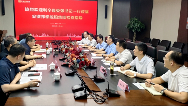 2024年7月7日,利辛縣委書記張吉明、利辛縣委常委、副縣長焦鵬、利辛縣經(jīng)開區(qū)管委會主任郭全德、利辛縣城鄉(xiāng)建設(shè)發(fā)展投資集團董事長孫新等一行蒞臨安徽邦泰控股集團走訪調(diào)研,安徽邦泰控股集團董事長陳齊博士、總裁陳昌新、執(zhí)行總裁陳勇、副總裁王庚印等高管陪同。