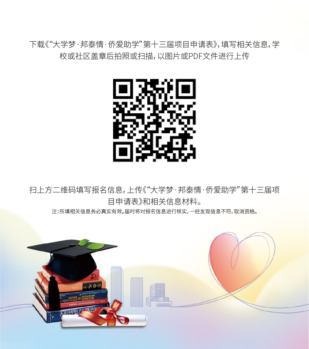 符合資助條件的大學(xué)新生,持大學(xué)錄取通知書(或成績單)、身份證、戶口簿和低保證、家庭收入聲明(非低保家庭)或直系親屬患重大疾病醫(yī)療費用(近一年內(nèi))清單的復(fù)印件,并按要求如實填寫《“大學(xué)夢·邦泰情·僑愛助學(xué)”第十三屆項目申請表》。